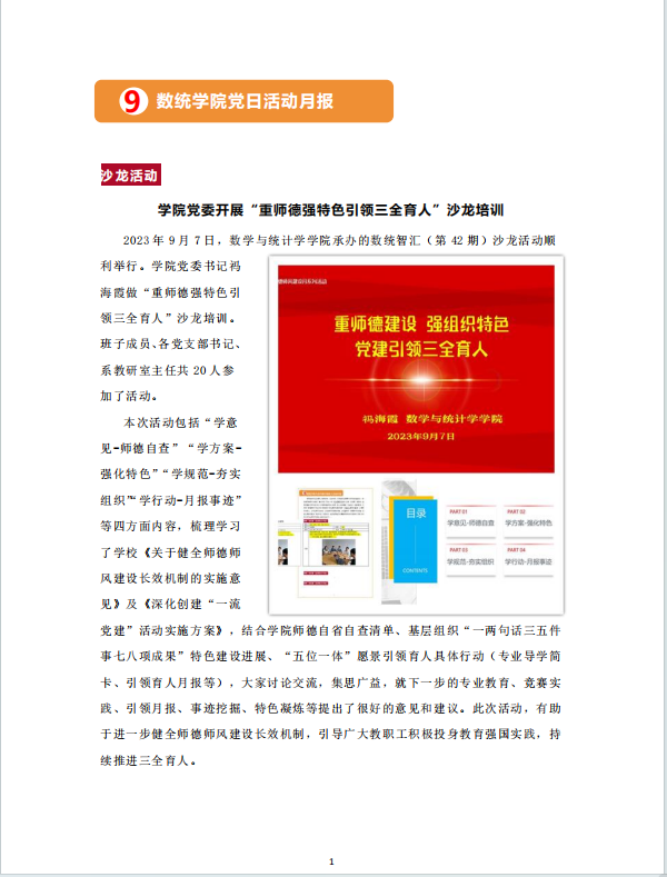 2023年9月7日,数学与统计学公司承办的数统智汇(第42期)沙龙活动顺利举行。公司党委书记祃海霞做“重师德强特色引领三全育人”沙龙培训。班子成员、各党支部书记、系教研室主任共20人参加了活动。