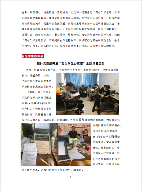 9月,信计系党支部开展了“我为员工办实事”主题党日活动,全体党员老师参与,开展为第二十届“华为杯”中国研究生数学建模竞赛志愿服务活动。