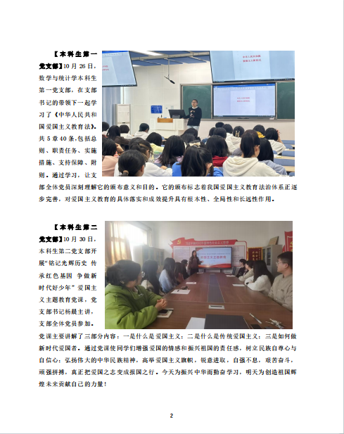 【本科生第二党支部】10月30日,本科生第二党支部开展“铭记光辉历史 传承红色基因 争做新时代好少年”爱国主义主题教育党课,党支部书记杨晨主讲,支部全体党员参加。党课主要讲解了三部分内容:一是什么是爱国主义;二是什么是传统爱国主义;三是如何做新时代爱国者。通过党课使同学们增强爱国的情感和振兴祖国的责任感,树立民族自尊心与自信心;弘扬伟大的中华民族精神,高举爱国主义旗帜,锐意进取,自强不息,艰苦奋斗,顽强拼搏,真正把爱国之志变成报国之行。今天为振兴中华而勤奋学习,明天为创造祖国辉煌未来贡献自己的力量!