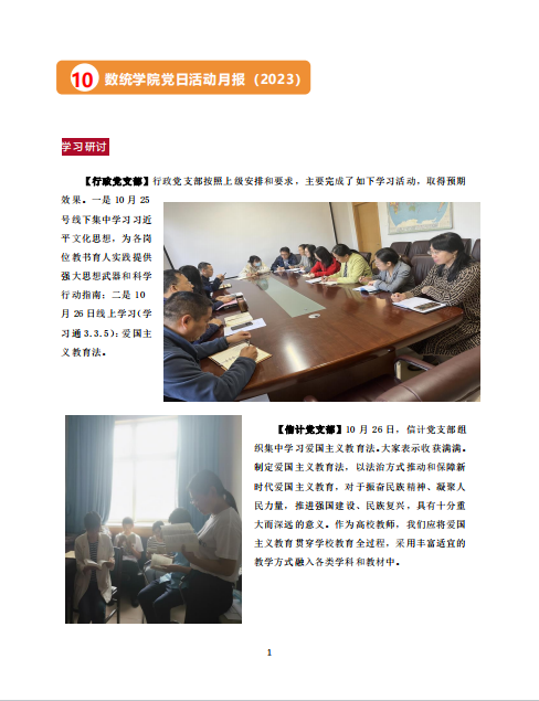 【行政党支部】行政党支部按照上级安排和要求,主要完成了如下学习活动,取得预期效果。一是10月25号线下集中学习习近平文化思想,为各岗位教书育人实践提供强大思想武器和科学行动指南;二是10月26日线上学习(学习通3.3.5):爱国主义教育法。