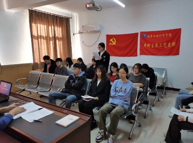 王洋首先带领本科三支部全体党员学习了习近平总书记在建党百年时的讲话,并希望青年党员们把爱党爱国爱民的朴素高尚情怀深深植根于心中,自觉坚持党的领导,听党话、感党恩、跟党走。同时,必须不断锤炼过硬本领、增长自身才干,拓宽思维视野、提高认知水平,积极探求科学真理、淬炼真知灼见,用实际行动践行胸怀天下的责任担当,为全面建设社会主义现代化国家贡献聪明才智,不辜负党和人民的信任、期望和重托,成为可堪大用、能担重任的栋梁之才。