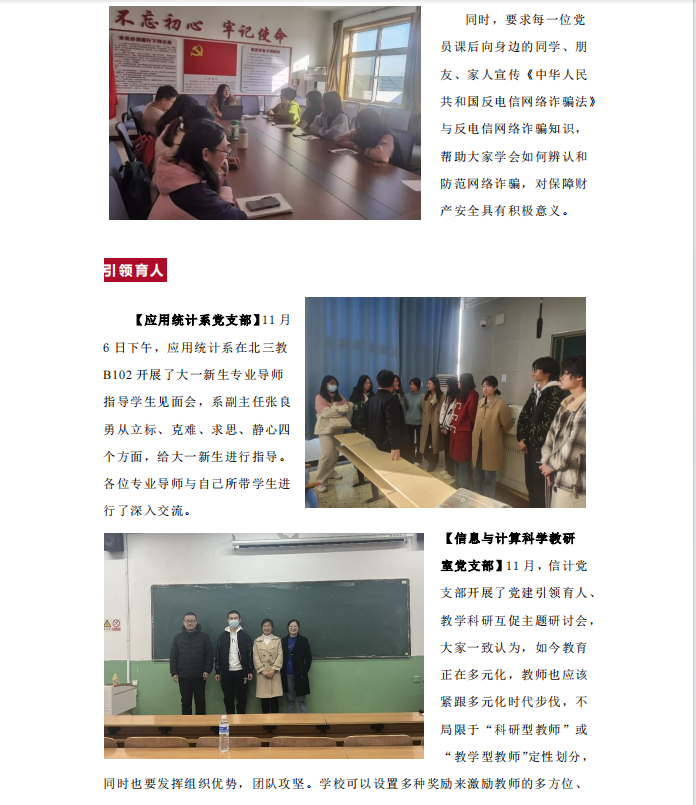 【信息与计算科学教研室党支部】11月,信计党支部开展了党建引领育人、教学科研互促主题研讨会,大家一致认为,如今教育正在多元化,教师也应该紧跟多元化时代步伐,不局限于“科研型教师”或“教学型教师”定性划分,同时也要发挥组织优势,团队攻坚。公司可以设置多种奖励来激励教师的多方位、跨学科发展。