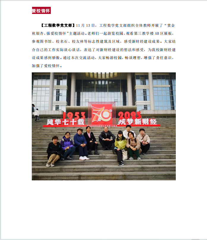 【工程数学党支部】11月13日,工程数学党支部组织全体教师开展了“赏金秋银杏,强爱校情怀”主题活动。老师们一起游览校园,观看第三教学楼AB区展板,参观图书馆、校名石、员工林等标志性建筑及区域,感受新财经建设成果。大家结合自己的工作实际谈心谈话,表达了对新财经建设的想法和感受,为公司新财经建设成果感到骄傲。通过本次交流活动,大家畅游校园,畅谈理想,增强了责任意识,加强了爱校情怀。