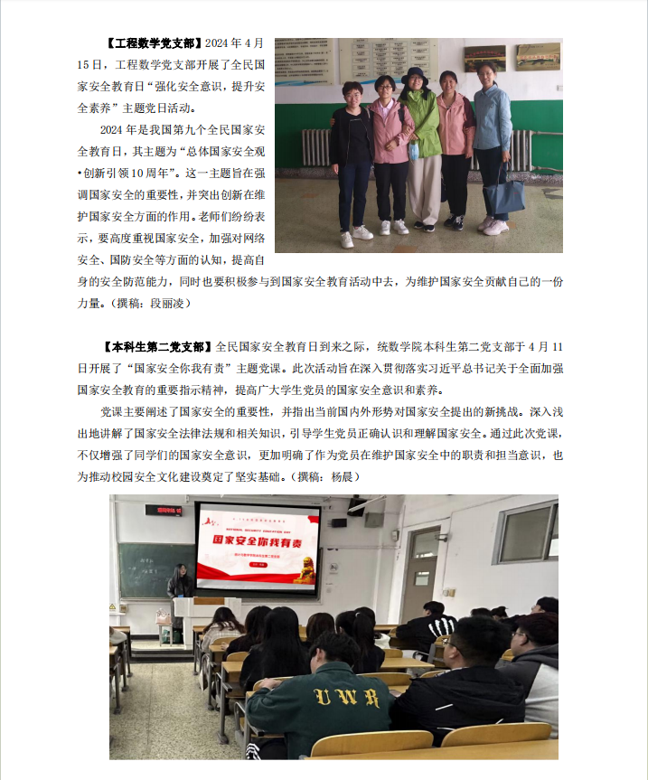 【工程数学党支部】2024年4月15日,工程数学党支部开展了全民国家安全教育日“强化安全意识,提升安全素养”主题党日活动。