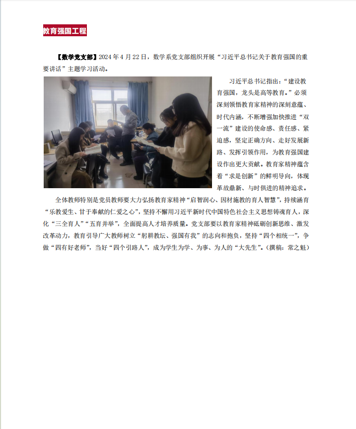 【数学党支部】2024年4月22日,数学系党支部组织开展“习近平总书记关于教育强国的重要讲话”主题学习活动。