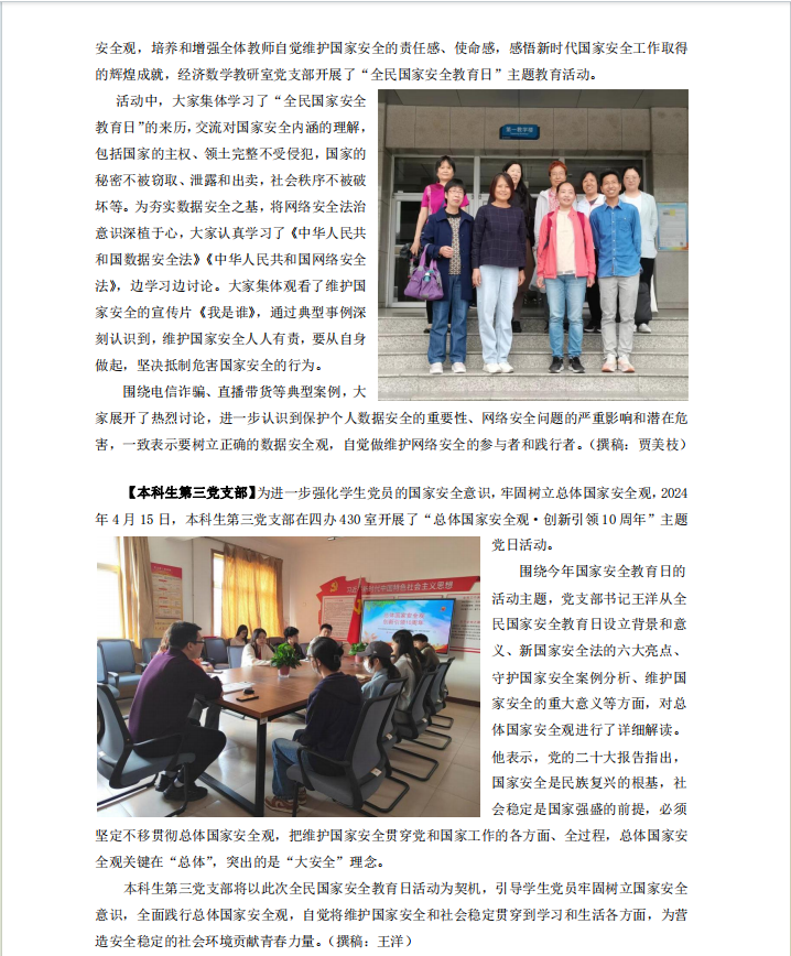 【本科生第三党支部】为进一步强化员工党员的国家安全意识,牢固树立总体国家安全观,2024年4月15日,本科生第三党支部在四办430室开展了“总体国家安全观·创新引领10周年”主题党日活动。
