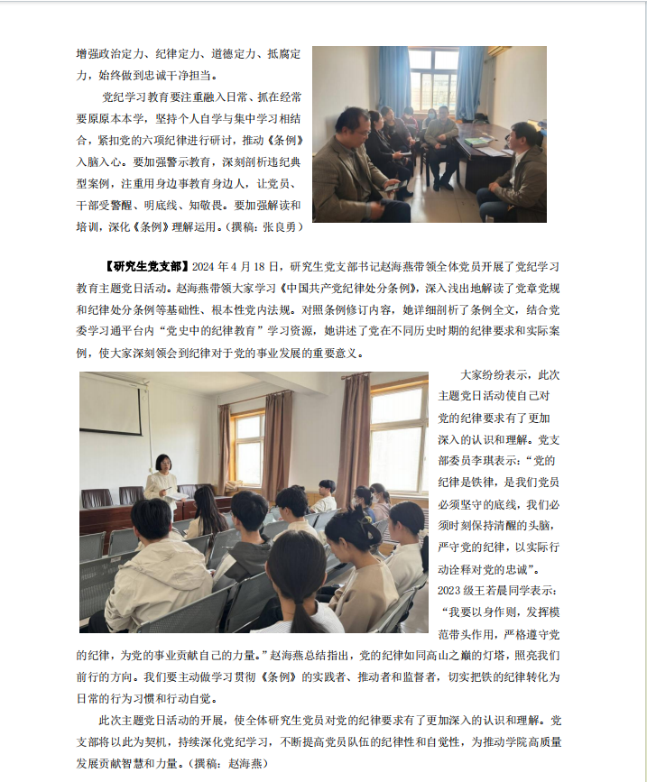 【研究生党支部】2024年4月18日,研究生党支部书记赵海燕带领全体党员开展了党纪学习教育主题党日活动。赵海燕带领大家学习《中国共产党纪律处分条例》,深入浅出地解读了党章党规和纪律处分条例等基础性、根本性党内法规。对照条例修订内容,她详细剖析了条例全文,结合党委学习通平台内“党史中的纪律教育”学习资源,她讲述了党在不同历史时期的纪律要求和实际案例,使大家深刻领会到纪律对于党的事业发展的重要意义。