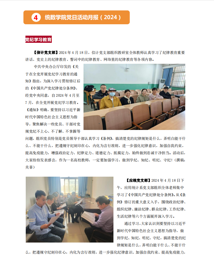 【应统党支部】2024年4月18日下午,应用统计系党支部组织全体老师集中学习了《中国共产党纪律处分条例》。从《条例》修订的重大意义入手,围绕政治纪律、组织纪律、廉洁纪律、群众纪律、工作纪律、生活纪律等六个方面展开深入学习。
