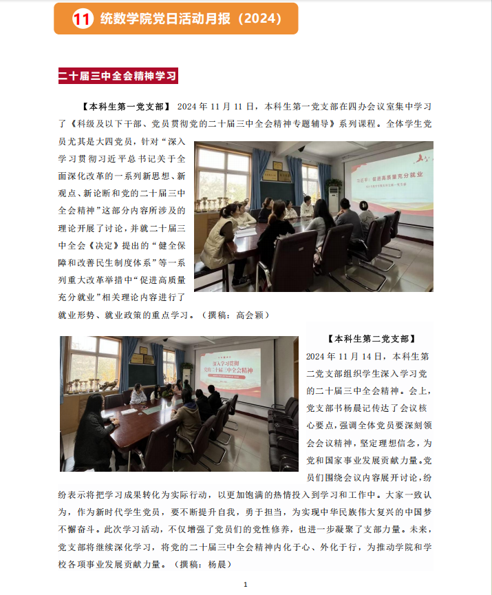 【统计系党支部】2024年11月,统计系党支部开展了二十届三中全会精神、《论教育》等政治理论学习以及“精研细作,助力学术成长”主题系列活动,助力育人。党员教师发挥专业特长和先锋模范作用,开展专题讲座、论文写作工作坊、一对一答疑,提供针对性指导和建议,员工们独立研究和解决问题的能力明显增强,活动取得显著成效。员工们纷纷表示,在党员教师的指导下,对学术研究有了更深刻的理解,对未来的学术道路充满信心。(撰稿:申博)