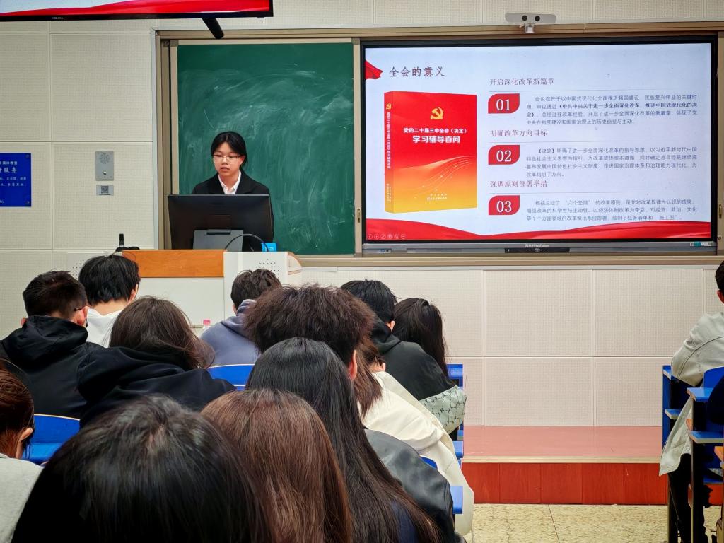 杜曼详细向大家介绍了党的二十届三中全会召开的背景、意义、主题与任务,解读了全面深化改革和中国式现代化的内涵。希望入团积极分子们将个人奋斗融入国家发展,在中国式现代化建设中贡献青春力量。