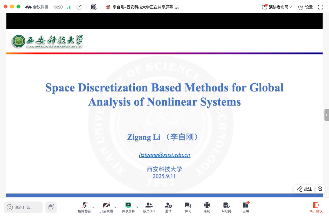 9月11日下午,陕西科技大学李自刚教授应bevictor伟德官网邀请在线上作题为“Spatial Discretization Based Methods for Global Analysis of Nonlinear Systems”的学术报告,相关专业师生20余人参会。