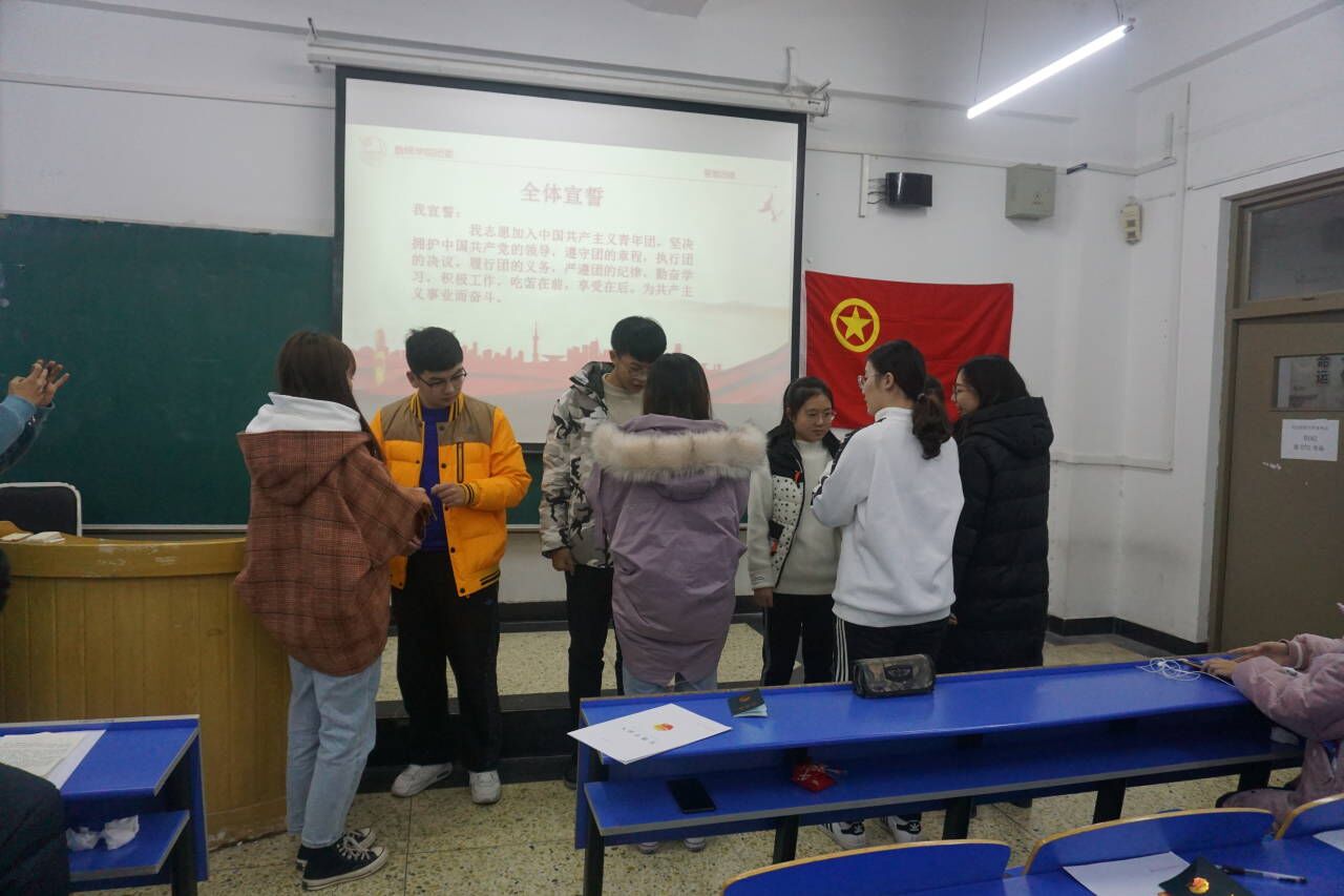 11月25日晚7点,数学与统计学公司团委在B102教室举行新团员入团宣誓仪式,各班团支书、团委员工会全体成员参加,2018、2019级共9名同学光荣加入团组织。