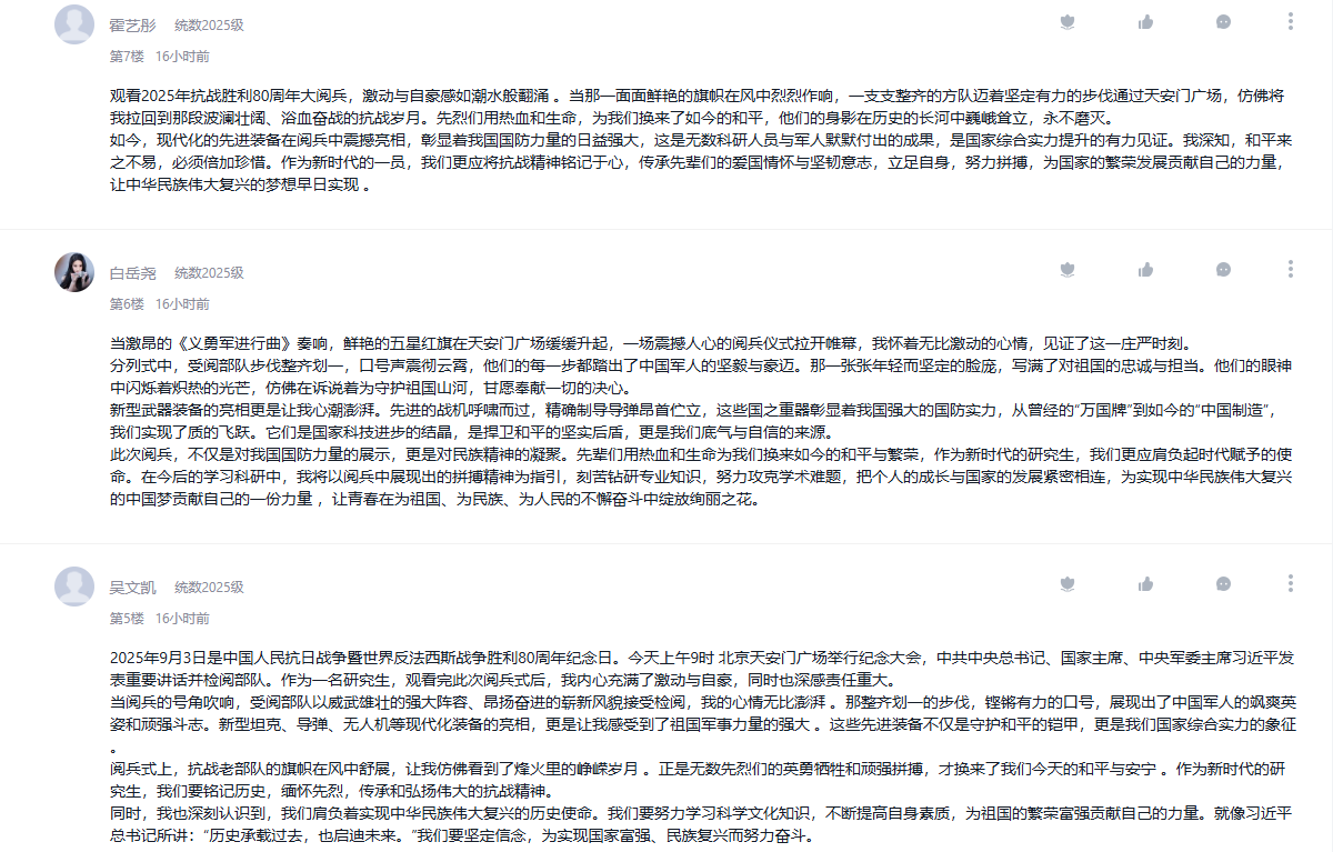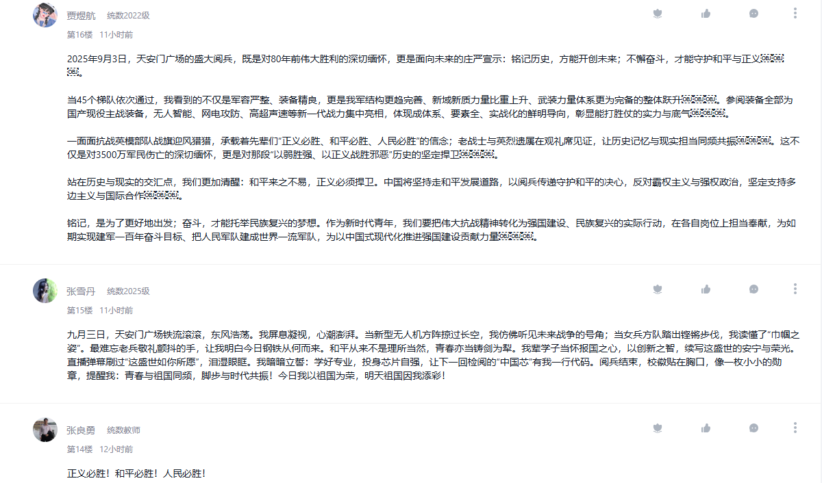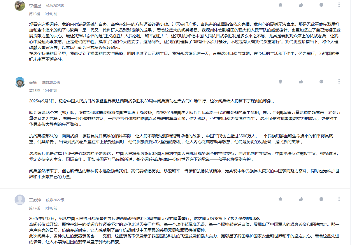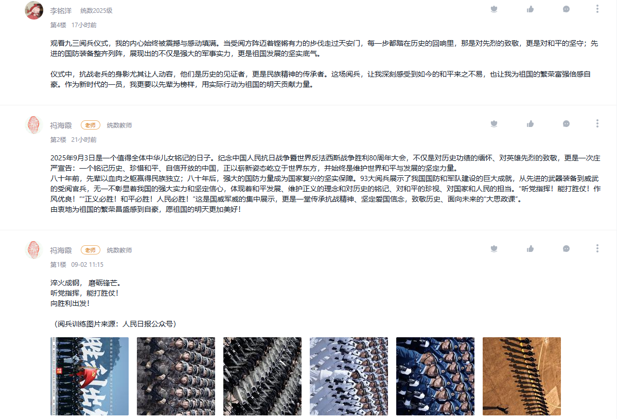 9月3日,纪念中国人民抗日战争暨世界反法西斯战争胜利80周年大会在北京隆重举行。公司把观看纪念大会和阅兵仪式作为一堂思政大课,纳入2025级新生军事训练、课堂教学、党团支部和班级的重要活动内容,并在《向学统数》学习通党建课程平台开设交流专区,师生通过各类平台观看直播盛况,引起热烈反响。