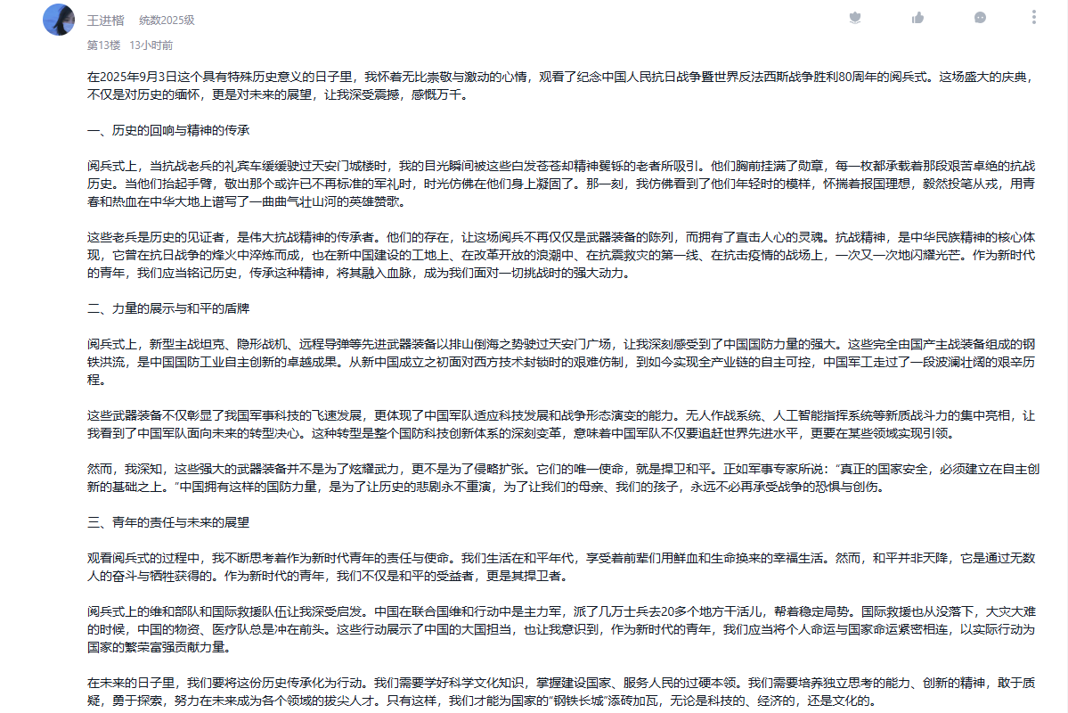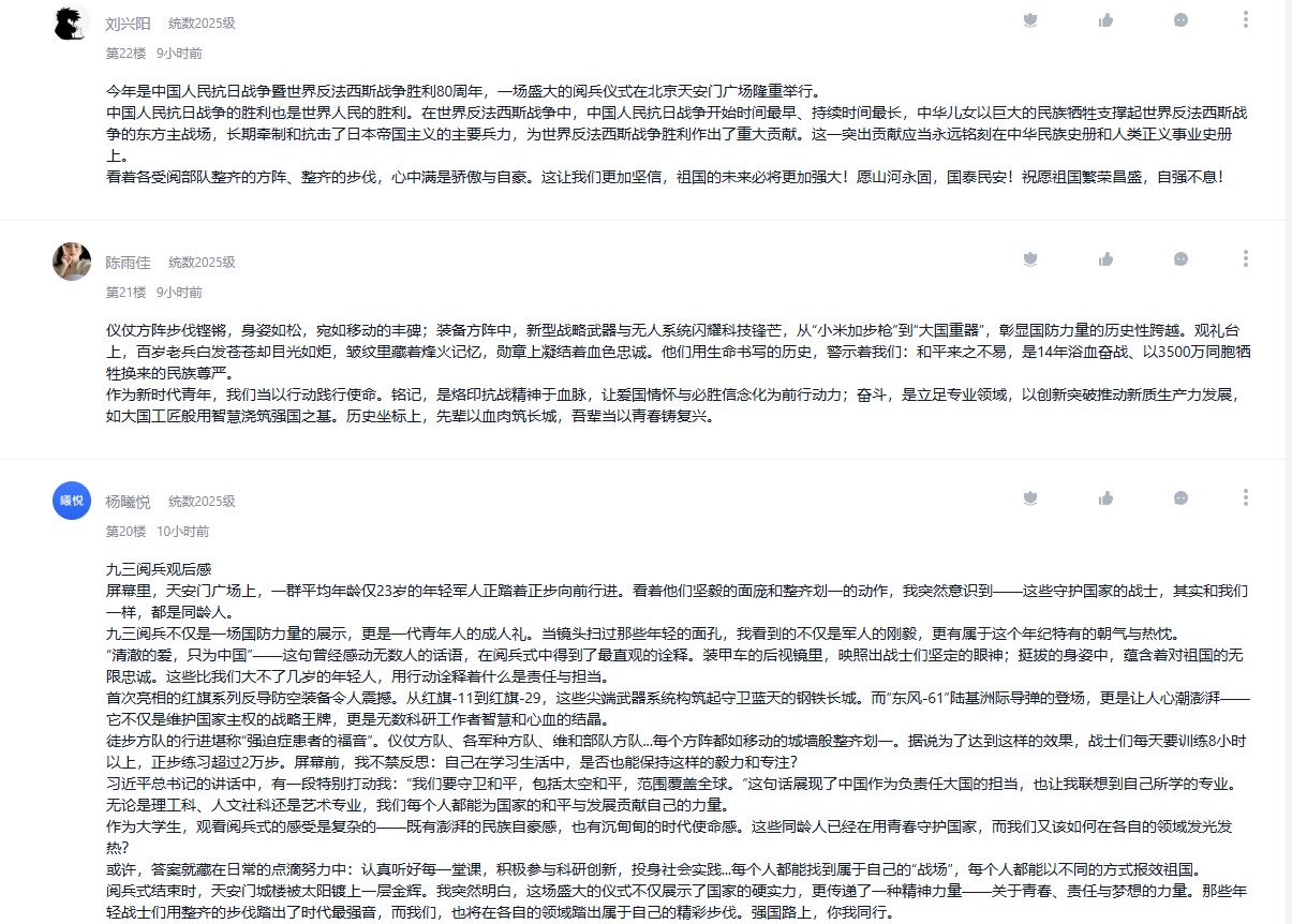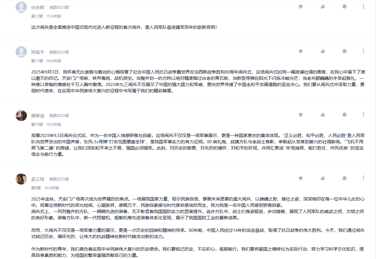 9月3日,纪念中国人民抗日战争暨世界反法西斯战争胜利80周年大会在北京隆重举行。公司把观看纪念大会和阅兵仪式作为一堂思政大课,纳入2025级新生军事训练、课堂教学、党团支部和班级的重要活动内容,并在《向学统数》学习通党建课程平台开设交流专区,师生通过各类平台观看直播盛况,引起热烈反响。