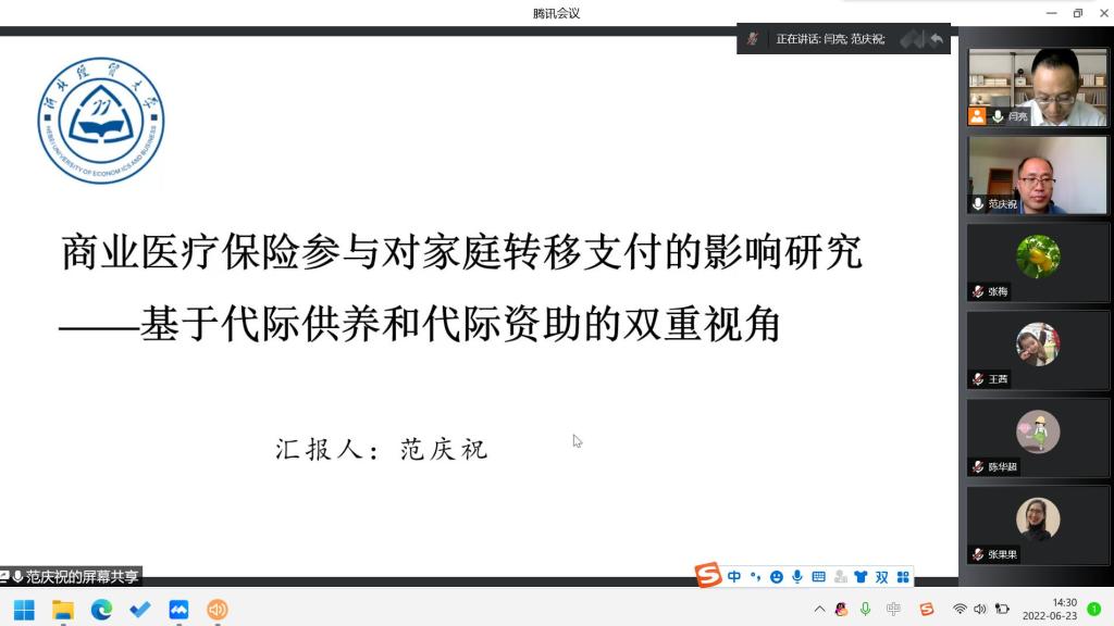 6月23日下午,数统公司邀请金融公司范庆祝副教授在腾讯会议平台作题为《商业医疗保险参与对家庭转移支付的影响研究——基于代际供养和代际资助的双重视角》的学术报告。报告由数统公司副经理闫亮主持,30余名教师和员工参加。