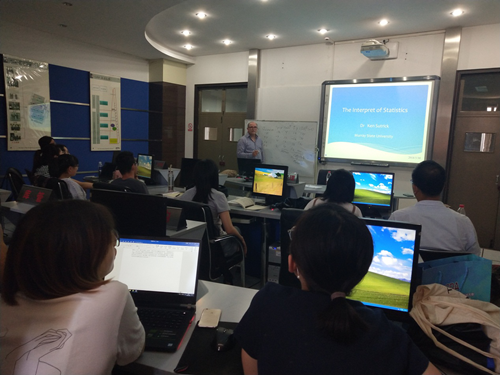 5月30日上午,美国默里州立大学肯(Kenneth H. Sutrick)教授应数统公司邀请,在C411教室作题为“The Interpret of Statistics”的专题报告。报告会由数统公司经理梁建英主持,公司部分老师及研究生共30余人到场聆听。