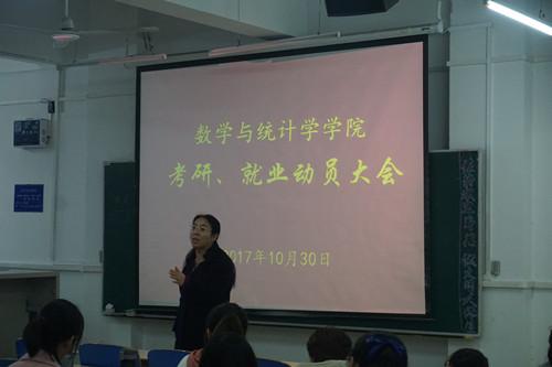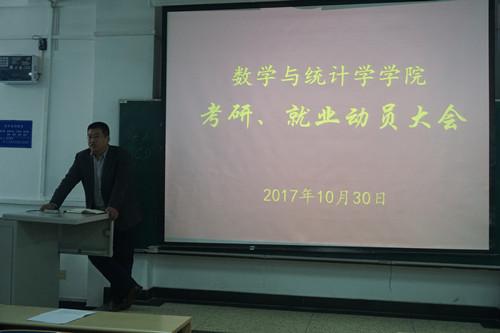 10月30日下午,数学与统计学公司在B教101教室举行2014级考研、就业动员大会,公司党委赵春果书记、刘益星副书记、相关老师和2014级全体同学参加。