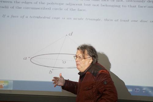 Tudor Zamfirescu教授第一次来公司,被美丽的校园风景所吸引,并对数统公司的热情接待表示感谢。 Tudor Zamfirescu教授首先介绍了最新研究课题---圆盘被笼子(即三维空间多面体的1-骨架)持住的问题,他利用风趣幽默的语言,介绍了四面体笼子和五面体笼子可持住圆盘的数量问题研究,课题非常有趣,而且具有一定的实际应用价值。整场报告深入浅出,极大地开阔了师生视野,增加了同学们对数学学习的热情,同时对公司数学教学与科研也有很大的启发与帮助。报告会后,同学们表示通过报告加深了对数学学科的认知,进一步明确了专业学习目标,将以更加积极的态度和饱满的热情投入到今后的学习生活中。