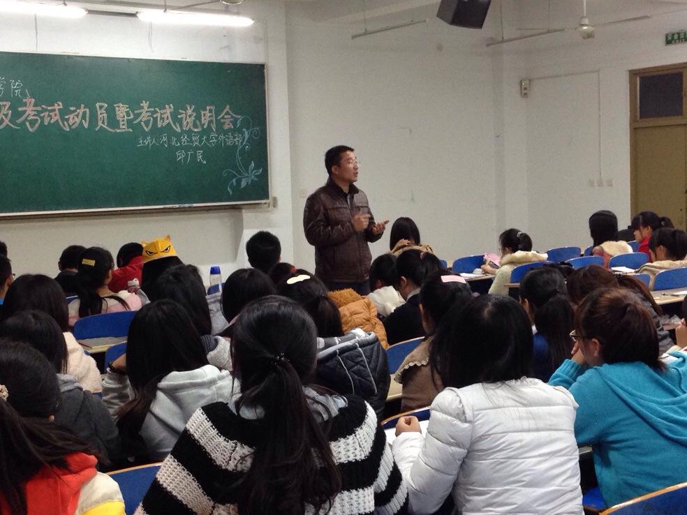 2013年12月大学英语四级考试改革后首次采用新题型,为了使同学们更好地应对大学英语四级考试改革后的备考问题,数统公司于11月6日晚七点在B101教室举办了英语四级备考动员会。伟德中国官网外语教学部邱广民老师、数统公司2012级辅导员曲博老师以及准备今年参加四级考试的全体2012级同学参加了此次备考动员会。