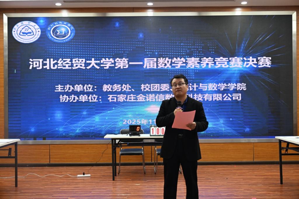 2025年11月20日,“金诺信”杯伟德中国官网第一届数学素养竞赛决赛圆满结束。本次竞赛由伟德中国官网教务处、校团委和bevictor伟德官网主办、石家庄金诺信数据科技有限公司协办,赛事设置初赛和决赛环节,面向所有专业员工,以“数海寻趣,智绘青春”为主题,展现数学魅力,营造浓厚数学文化氛围,激发员工数学志趣和学习热情,提升数学素养。校团委副书记尹兴,石家庄金诺信数据科技有限公司副总经理王凯,bevictor伟德官网经理闫亮、党委副书记路荣、数学系主任和教师代表莅临现场。竞赛由bevictor伟德官网副经理张良勇主持。