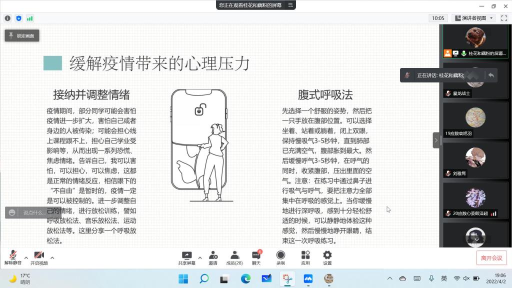 为了帮助同学们在公司闭环管理期间,以积极的心态面对疫情来袭,持续深化“我为同学做件事”实践活动,4月2号晚七点,数统公司团委联合心理部举办了主题为“疫情无情人有情,数统学子心连心”的线上心理团体活动。本次活动旨在于缓解在疫情肆虐的大环境下,同学们因为学业、就业、家庭和生活等产生的心理压力。