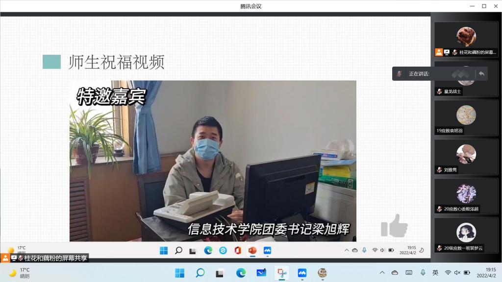 本次活动分为四个部分:第一个部分是公司对于疫情的防控措施和针对线上学习的方法建议;第二个部分是针对大家在学习、就业、家庭以及生活中产生的压力,提供一些方法和建议;第三个部分是邀请了公司、公司老师以及本院部分员工拍摄的师生祝福视频;第四个部分是对同学们的未来展望。