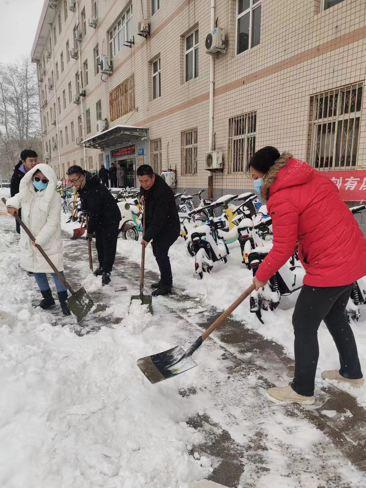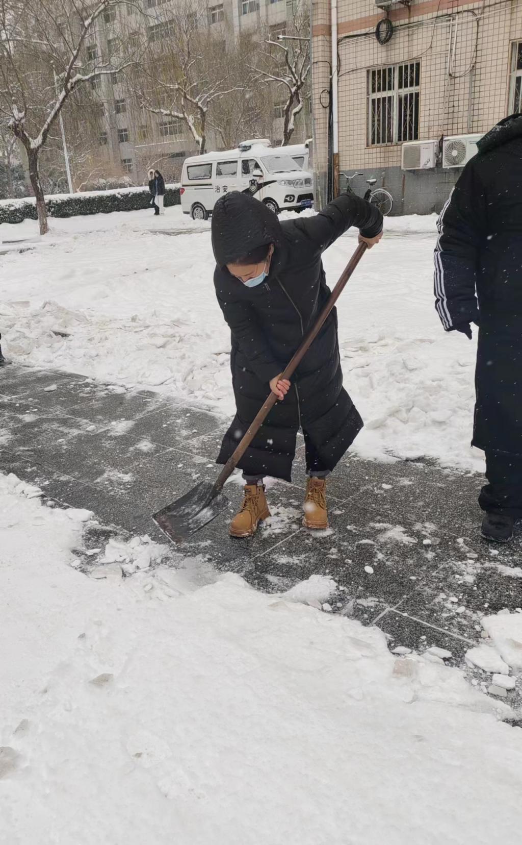 大雪之后的天气十分寒冷,却丝毫没有挡住老师和员工们劳动的热情,师生们积极主动,不畏严寒,纷纷拿着铁锹、铲子、扫帚等清雪工具积极投入清雪工作中去:扫积雪、铲冰层、清杂物、除路障,大家相互配合、齐心协力,你铲我扫,呈现出一派热火朝天的景象。