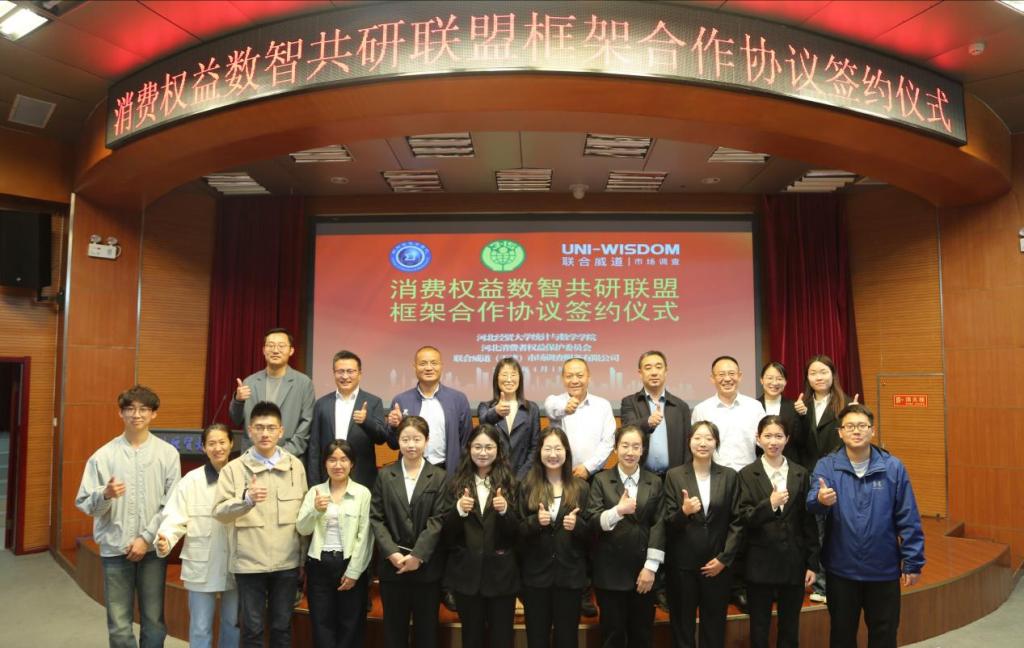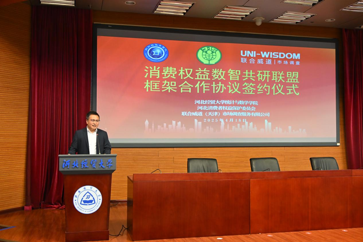 4月18日下午,“消费权益数智共研联盟”框架合作协议签约仪式暨“伟德中国官网消费维权志愿者服务站”授牌仪式在伟德中国官网国际学术报告厅隆重举行。河北省消费者权益保护委员会秘书长王守用、副秘书长赵晓峰、监督部主任赵志强,联合威道(天津)市场调查服务有限公司总经理刘恒超、研究员柴朋元,统计与数学公司党委书记祃海霞、经理闫亮、副书记路荣、团委书记(学工办主任)王洋、就业联络员高会颖以及200余名师生代表参加本次活动。活动由路荣主持。
