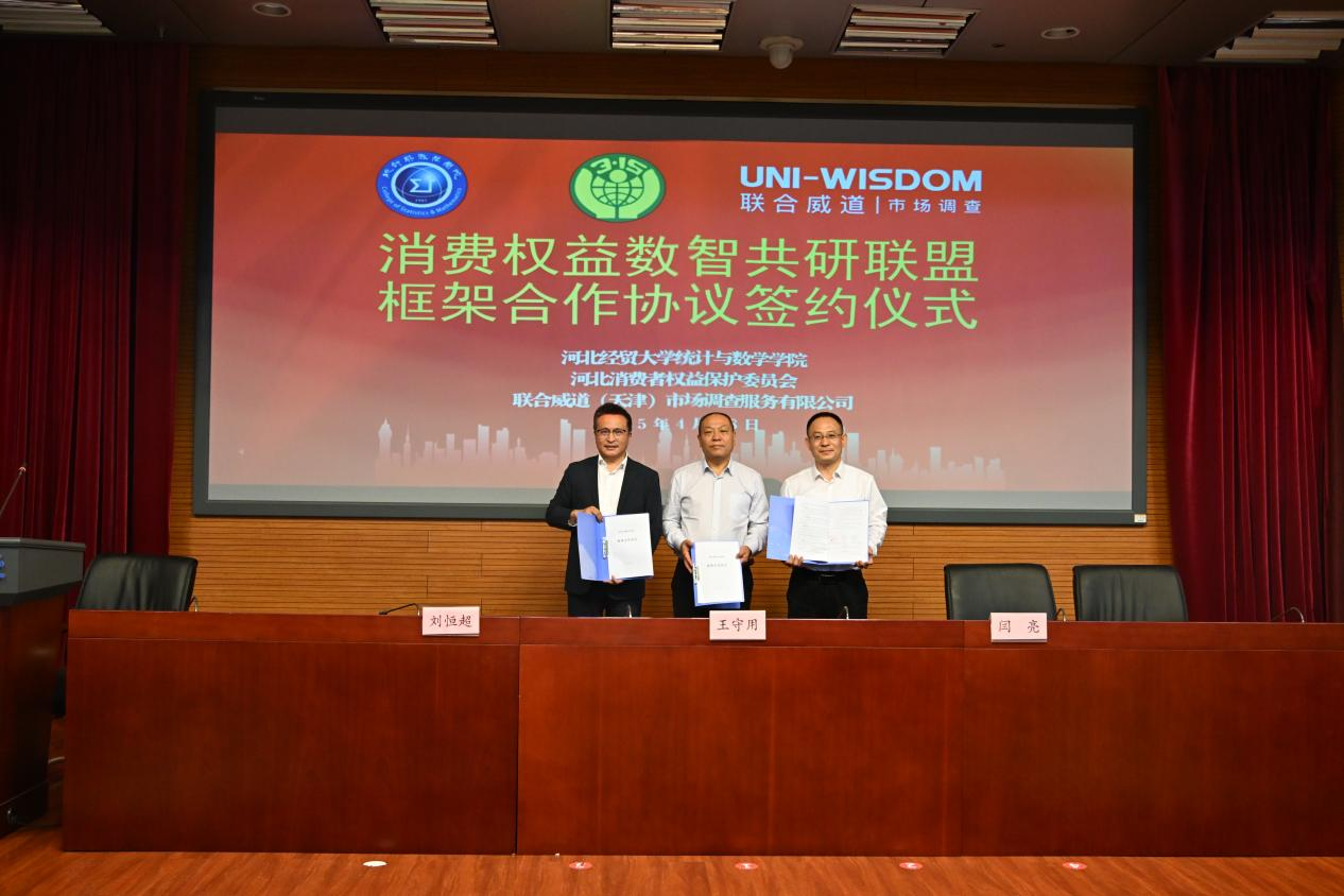 王守用、闫亮、刘恒超分别代表三方签署“消费权益数智共研联盟”框架合作协议。此次签约标志着三方合作正式开启,以促进消费维权、高校、企业和社会的共同进步为目标,在人才培养、学术交流、实践教学、社会调查等领域开展长期深入合作、互利共赢、共同发展。