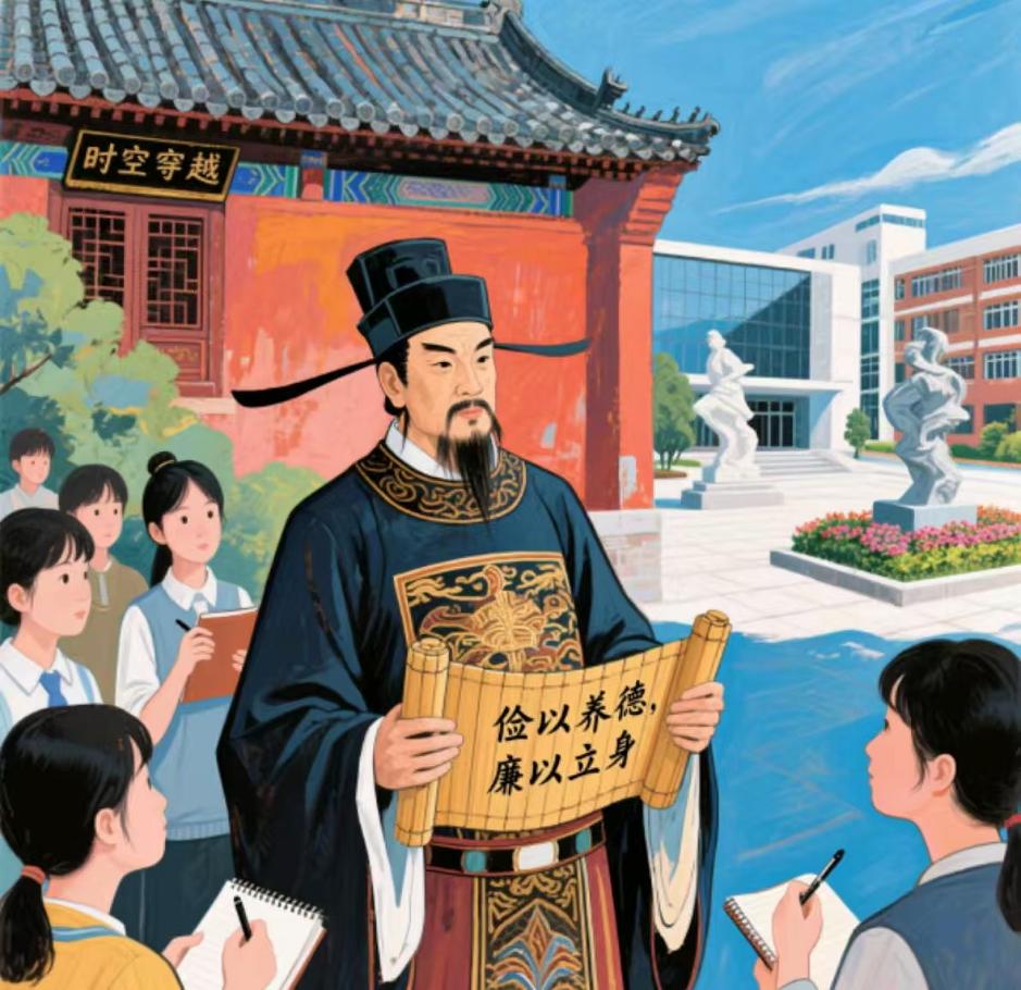 时空穿越廉洁绘:描绘古代廉吏与现代人物在同一时空交流的场景。古代廉吏如海瑞等身着古装,手持写有廉洁警句的竹简;现代人物是公司师生模样,拿着笔记本和笔虚心讨教。背景用渐变色彩,一边是古色古香的建筑,一边是现代化的校园,体现廉洁精神的传承。(创作团队:2024应统二班王泉心、陈艺璇、郭鑫皓)
