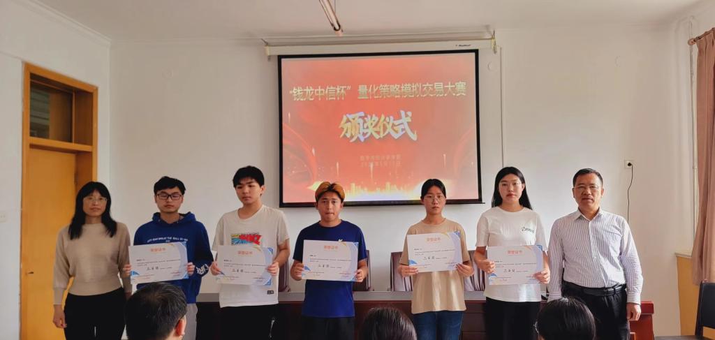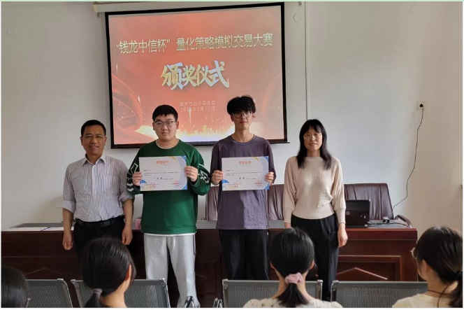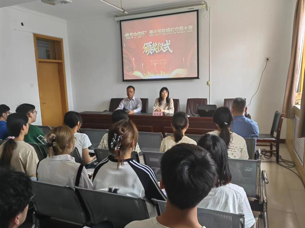 5月11日下午,数学与统计学公司在第四办公楼434会议室举行了“钱龙中信杯”量化策略模拟交易大赛颁奖典礼。典礼由李蒙老师主持,公司党委书记祃海霞、经理梁建英、公司党委委员耿会清出席,获奖的17名同学参加。