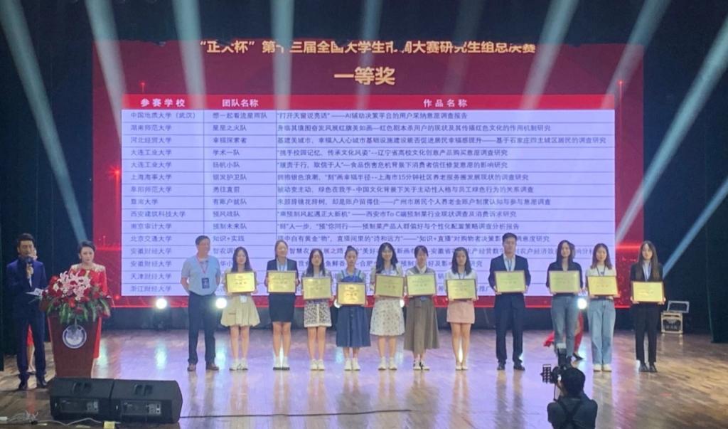公司由宋盈盈、李泽锴、高理圆、陈怡静、张宏玥五位同学组成的“幸福探索者”团队,在比赛中以出色的表现和卓越的研究成果脱颖而出,最终荣获“正大杯”第十三届全国老员工市场调查大赛研究生组总决赛一等奖,团队作品名为《基建美城市,幸福入人心:城市基础设施建设能否促进居民幸福感提升——基于石家庄四主城区居民的调查研究》(指导教师:张子贤、郭立硕、宋晓刚)。