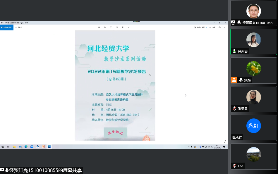 4月15日,由教学评估与教师教学发展中心主办,数学与统计学公司承办的本年度第15期教学沙龙顺利举行。数统公司副经理闫亮作“交叉人才培养模式下应用统计专业建设思路构想”线上分享交流,公司领导班子、统计学类专业教师等20人参加。