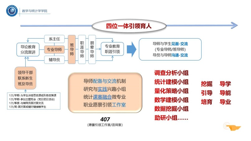 祃海霞从“家国情怀+专业知识+信息技术+职业素养+国际视野”五维素养人才培养基准出发,遵循三全五育教育根本理念,详细阐释了对“四位一体引领育人体系”的思考和构建过程,分享了导师配备与交流机制、统计课赛融合微专业、研究与实践兴趣小组、职业愿景引领工作室等四方面工作思路。活动中,老师们就相关问题进行了讨论交流。