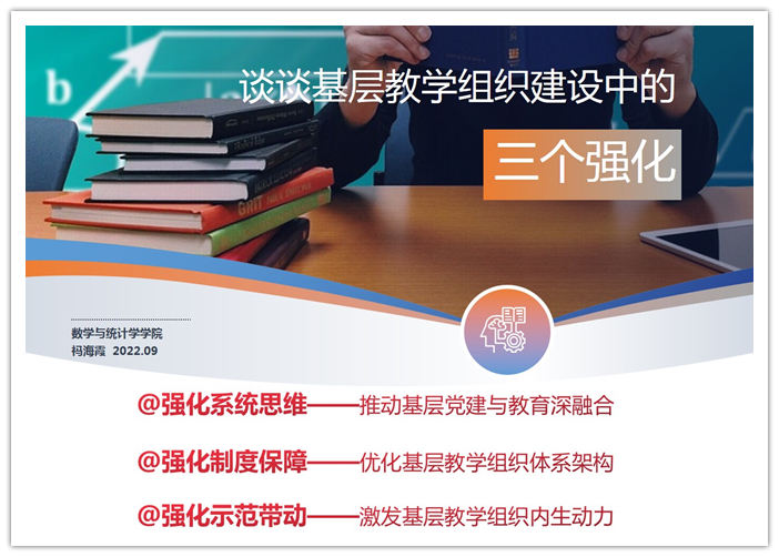 9月5日,由教学评估与教师教学发展中心主办、数学与统计学公司承办的本年度第45期教学沙龙顺利举行。数统公司党委书记祃海霞教授通过腾讯会议做“谈谈基层教学组织建设中的三个强化”研讨交流。
